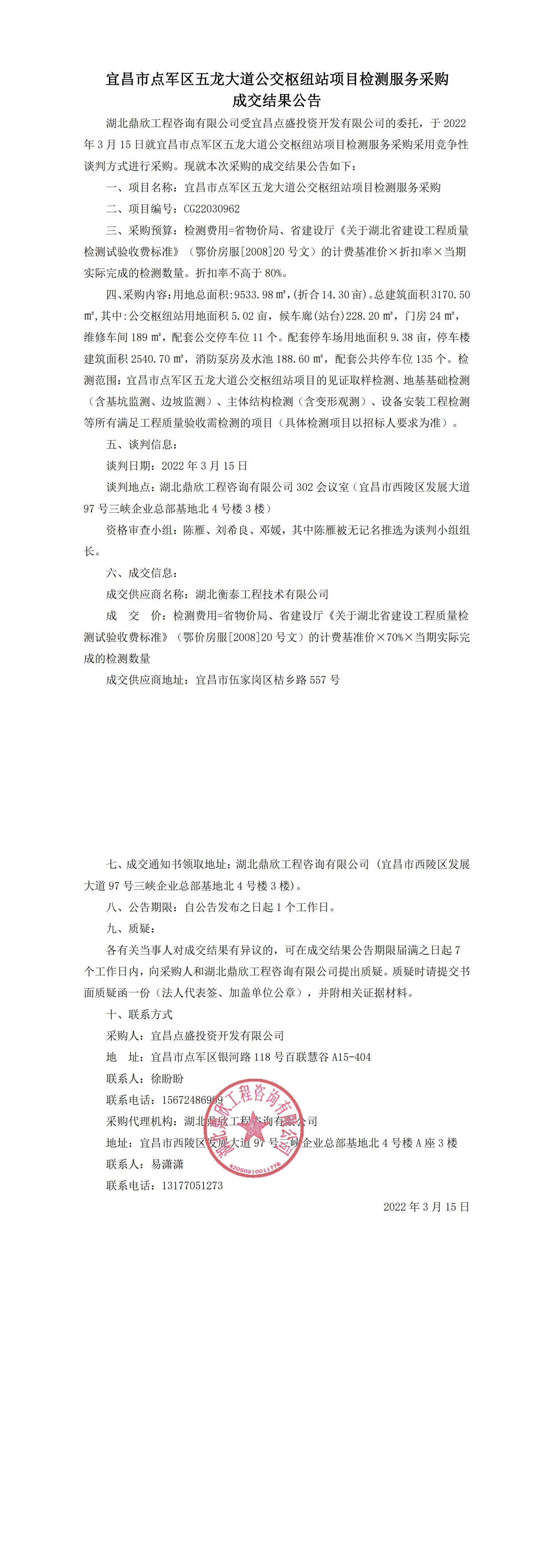 宜昌市點(diǎn)軍區(qū)五龍大道公交樞紐站項(xiàng)目檢測(cè)服務(wù)采購(gòu)結(jié)果公告