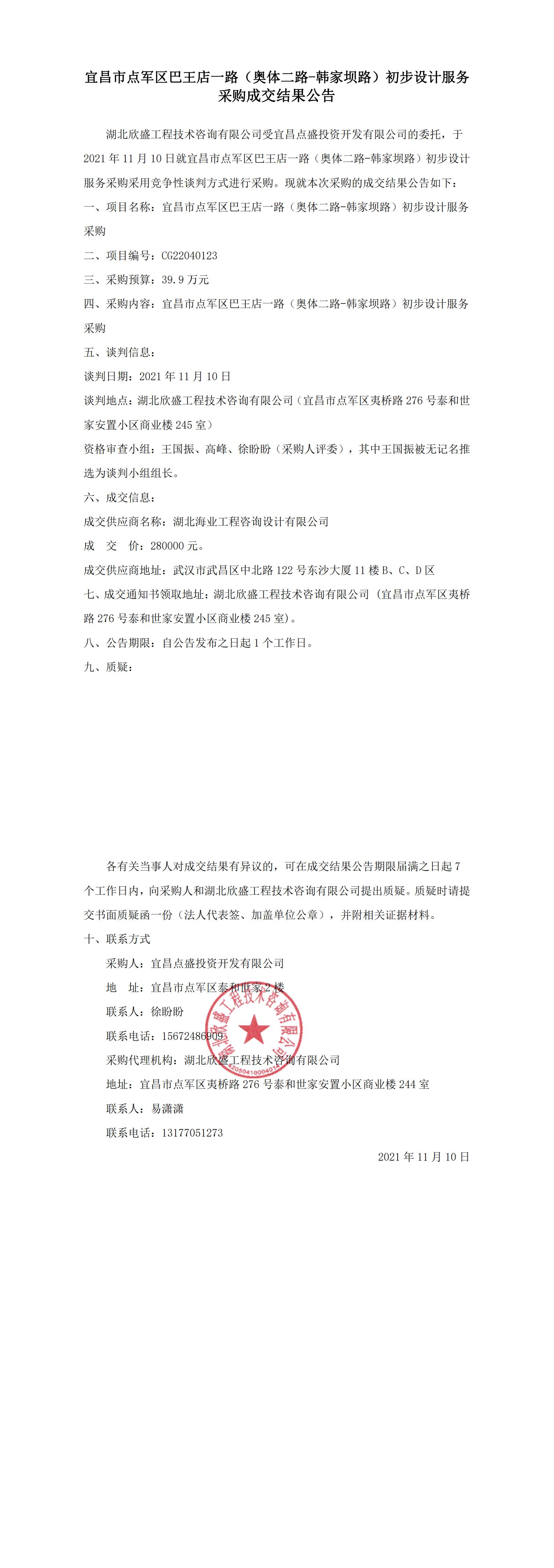 宜昌市點(diǎn)軍區(qū)巴王店一路(奧體二路-韓家壩路)初步設(shè)計(jì)服務(wù)采購成交結(jié)果公告