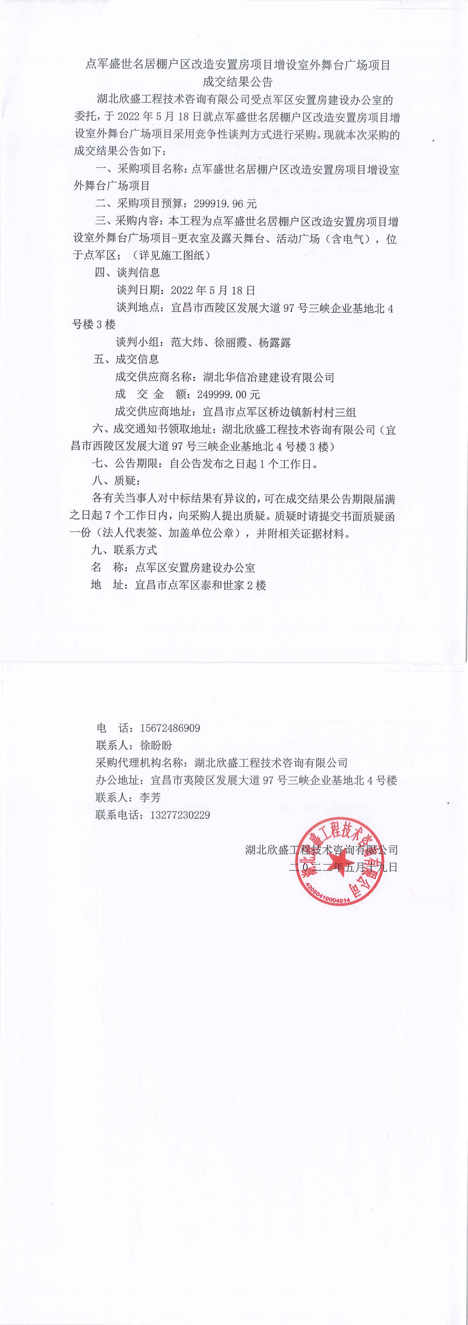 點(diǎn)軍盛世名居棚戶區(qū)改造安置房項(xiàng)目增設(shè)室外舞臺廣場項(xiàng)目成交公告