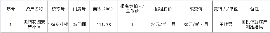 根據(jù)《點軍區(qū)出資企業(yè)資產(chǎn)租賃管理暫行辦法》及《宜昌點盛投資開發(fā)有限公司國有資產(chǎn)經(jīng)營使用實施辦法修訂版(2022.3)》,現(xiàn)對奧錦花園小區(qū)商業(yè)2#門面三年租賃權(quán)公開招租結(jié)果公告如下: