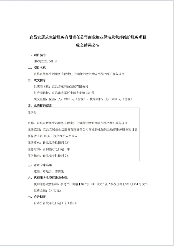 宜昌宜居樂生活服務(wù)有限責(zé)任公司商業(yè)物業(yè)保潔及秩序維護(hù)服務(wù)項(xiàng)目成交結(jié)果公告