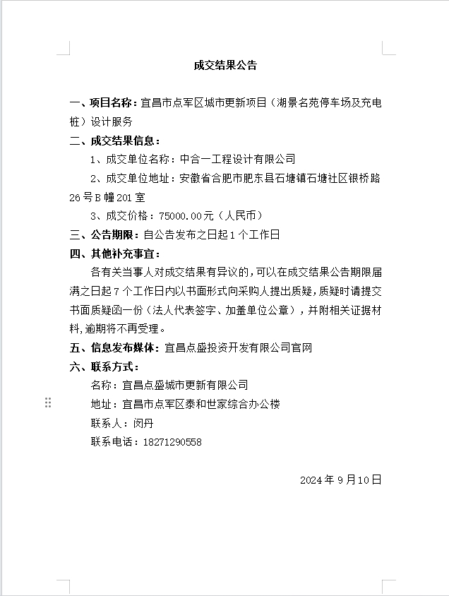 宜昌市點軍區(qū)城市更新項目(湖景名苑停車場及充電樁)設計服務成交公告