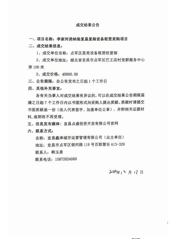 李家河銷(xiāo)鈉場(chǎng)復(fù)墾復(fù)綠設(shè)備租賃采購(gòu)項(xiàng)目成交公告