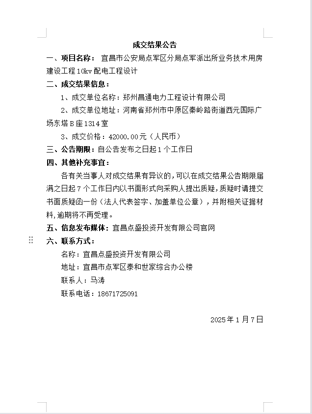 宜昌市公安局點軍區(qū)分局點軍派出所業(yè)務(wù)技術(shù)用房建設(shè)工程10kv配電工程設(shè)計成交公告