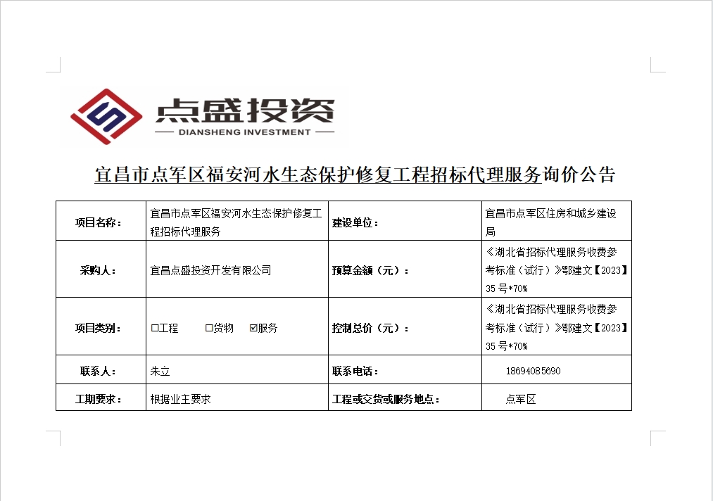 宜昌市點軍區(qū)福安河水生態(tài)保護修復工程招標代理服務詢價公告